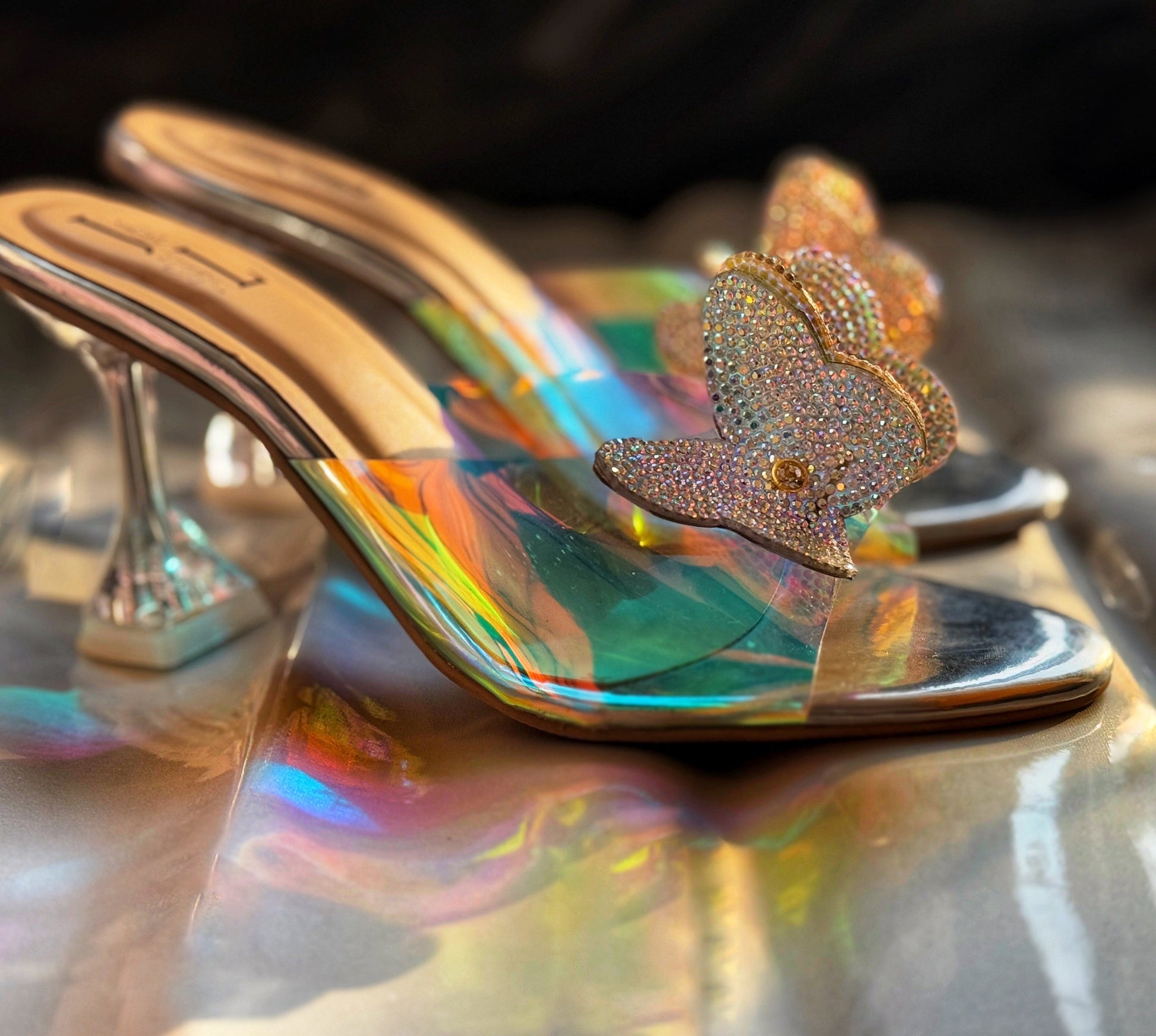 Material: Holographic Transparent upper ,Rhinestone embellished 3d butterflies